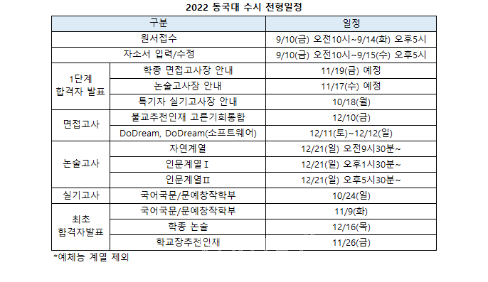 µ¿±¹´ë 2022 ¼ö½Ã ¿ø¼Á¢¼ö´Â 9¿ù10ÀϺÎÅÍ 14ÀϱîÁö 5Àϰ£ ÁøÇàµÈ´Ù. ÀÚ¼Ò¼ ÀÔ·ÂÀº 9¿ù10ÀϺÎÅÍ 15ÀϱîÁö´Ù. ÇÐÁ¾ 1´Ü°è ÇÕ°ÝÀÚ ¹ßÇ¥ÀÏÀº 11¿ù19ÀÏÀ̸ç, ¸éÁ¢°í»çÀÏÀº ºÒ±³ÃßõÀÎÀç¿Í °í¸¥±âȸÅëÇÕÀÌ 12¿ù10ÀÏ, DoDream°ú DoDream(¼ÒÇÁÆ®¿þ¾î)°¡ 12¿ù11ÀϺÎÅÍ 12ÀϱîÁö ¾çÀϰ£ÀÌ´Ù.