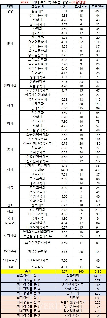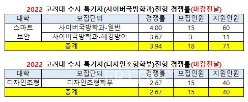 13ÀÏ ¿ÀÈÄ5½Ã 2022 ¼ö½Ã¸ðÁýÀ» ¸¶°¨ÇÏ´Â °í·Á´ë´Â ¸¶°¨Àü³¯ 12ÀÏ ¿ÀÈÄ4½Ã ±âÁØ 7.46´ë1(Á¤¿ø³»(Á¤¿ø¿Ü »çÀ̹ö±¹¹æÇаú/¹ÝµµÃ¼°øÇÐ Æ÷ÇÔ) ¸ðÁý2493¸í/1¸¸8592¸í)ÀÇ °æÀï·üÀ» ±â·Ï ÁßÀÌ´Ù. ¸ðµç ÀüÇüÀÇ ¸ðÁý´ÜÀ§¿¡¼ ¹Ì´ÞÀÌ ¹ß°ßµÇÁö ¾ÊÀº Ư¡ÀÌ´Ù. Áö³ÇØ Çб³ÃßõÀÇ °æ¿ì ¸¶°¨Àü³¯ °æÀï·ü¿¡¼ 20°³¸ðÁý´ÜÀ§¿¡¼ ¹Ì´ÞÀ» ºú°í ÀÖ´ø °Í°ú´Â ´Ù¸¥ ¾ç»óÀ» º¸À̰í ÀÖ´Ù.