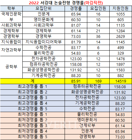 ¸¶°¨Á÷Àü ³í¼úÀüÇüÀº 85.91´ë1(169¸í/1¸¸4519¸í)ÀÇ °æÀï·üÀ» ±â·ÏÁßÀÌ´Ù. ¹°¸®ÇÐÀü°ø54.83´ë1(6¸í/329¸í) ¿µ¹Ì¹®È°è60.5´ë1(10¸í/605¸í) °æÁ¦ÇкÎ61.14´ë1(21¸í/1284¸í) Àι®°è65.94´ë1(16¸í/1055¸í) °æ¿µÇкÎ73.03´ë1(36¸í/2629¸í) ¼øÀ¸·Î ÃÖÀú°æÀï·ü Åé5 ¸ðÁý´ÜÀ§´Ù.