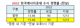 ´ÜÀÏÀüÇüÀÎ Çѱ¹¿¡³ÊÁö°ø´ë´Â ÀϹÝÀüÇü¿¡¼ 13.48´ë1ÀÇ °æÀï·üÀ» ±â·Ï ÁßÀÌ´Ù. 90¸í ¸ðÁý¿¡ 1213¸íÀÌ Áö¿øÇÑ °á°ú´Ù. Çѱ¹¿¡³ÊÁö°ø´ë´Â ¿©Å¸ °ú±â¿ø°ú ¸¶Âù°¡Áö·Î ¹«Çаú ´ÜÀÏÇкΠ¸ðÁýÀ» ½Ç½ÃÇÏ¸é¼ ÀüÇüº° °æÀï·ü¸¸ ÆÄ¾ÇÇÒ ¼ö ÀÖ´Ù.