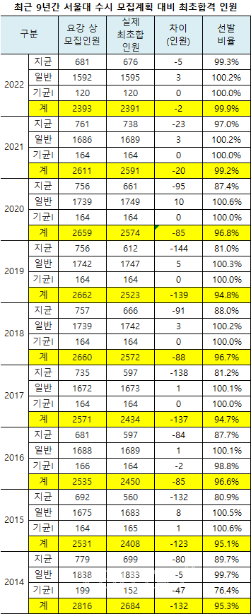 ¿ÃÇØ Áö±ÕÀÇ ½ÇÁ¦ ¼±¹ßºñÀ²Àº 99.3%·Î, ¼¿ï´ë°¡ Áö±Ý°ú °°ÀÌ Á¤±³ÇÑ ¼ö½Ã ÇÕ°ÝÀÚ ºÐ¼®ÀڷḦ ³»±â ½ÃÀÛÇÑ 2014Çгâ ÀÌÈķδ ÃÖ´ëÄ¡´Ù. ¿ä°»ó ¸ðÁýÀοø 684¸í °¡¿îµ¥ ½ÇÁ¦ 676¸íÀ» ¼±¹ßÇß´Ù. 2014Çгâ 89.7%, 2015Çгâ 80.9%, 2016Çгâ 87.7%, 2017Çгâ 81.2%, 2018Çгâ 88%, 2019Çгâ 81%, 2020Çгâ 87.4%, 2021Çгâ 97%, 2022Çгâ 99.3%ÀÇ ÃßÀÌ´Ù.