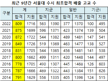 ¿ÃÇØ ¼¿ï´ë ¼ö½Ã ÃÖÃÊ ÇÕ°ÝÀÚ ¹èÃâ °í±³´Â 809°³±³·Î, Áö³ÇØ 875°³±³º¸´Ù 66°³±³ ÁÙ¾ú´Ù. 2016Çгâ ÀÌÈÄ °è¼ÓÇØ¼ ¹èÃâ °í±³°¡ È®´ëµÇ¾î ¿À´ø Ãß¼¼¸¦ 6³â ¸¸¿¡ ±ú¶ß·È´Ù. 2016Çгâ 778°³±³, 2017Çгâ 800°³±³, 2018Çгâ 831°³±³, 2019Çгâ 849°³±³, 2020Çгâ 872°³±³, 2021Çгâ 875°³±³ ¼øÀ¸·Î ²ÙÁØÈ÷ ´Ã¾î³ª´Ù 2022Çгâ 809°³±³·Î ÁÙ¾ú´Ù.