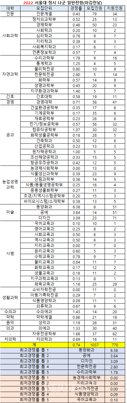 ¸¶°¨Àü³¯ ¿ÀÈÄ3½Ã ±âÁØ, ÃÖ°í°æÀï·ü ¸ðÁý´ÜÀ§´Â µ¿¾çȰú´Ù. 8¸í ¸ðÁý¿¡ 51¸íÀÌ Áö¿øÇØ 6.38´ë1À» ±â·ÏÁßÀÌ´Ù. °ø¿¹3.64´ë1(14¸í/51¸í) µðÀÚÀÎ3.09´ë1(23¸í/71¸í) õ¹®ÇÐÀü°ø2.8´ë1(5¸í/14¸í) ¼øÀ¸·Î 2´ë1À» ³Ñ´Â °æÀï·üÀÌ´Ù.