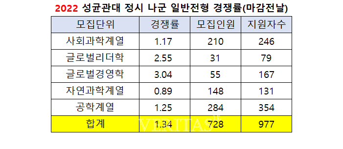 3ÀÏ ¿ÀÈÄ5½Ã ¿ø¼Á¢¼ö¸¦ ¸¶°¨ÇÏ´Â ¼º±Õ°ü´ëÀÇ ¸¶°¨Àü³¯ ¿ÀÈÄ5½Ã ±âÁØ °æÀï·ü(ÀÌÇÏ Á¤¿ø³» ±âÁØ)Àº 1.15´ë1·Î ³ªÅ¸³µ´Ù. °¡±ºÀÌ 770¸í ¸ðÁý¿¡ 753¸íÀÌ Áö¿øÇØ 0.98´ë1·Î ¹Ì´ÞÀ» °Þ°í ÀÖÀ¸¸ç, ³ª±ºÀº 728¸í ¸ðÁý¿¡ 977¸íÀÌ Áö¿øÇϸç 1.34´ë1·Î, 1´ë1ÀÇ °æÀï·üÀ» ³Ñ¾î¼¹´Ù. ¸¶°¨Àü³¯ ±âÁØ ¹Ì´ÞÀÎ ¸ðÁý´ÜÀ§´Â ÀÚ¿¬°úÇаè¿À» Æ÷ÇÔÇÑ 13°³´Ù.