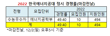 Çѱ¹¿¡³ÊÁö°ø´ë´Â 2022 Á¤½Ã¿¡¼ ¿ä°»ó 10¸íÀÇ ½ÅÀÔ»ýÀ» ¼±¹ßÇÑ´Ù. ¸¶°¨Àü³¯ÀÎ 2ÀÏ ¿ÀÈÄ5½Ã ±âÁØ ÀϹÝÀüÇüÀº 49.4´ë1ÀÇ °æÀï·üÀ» ±â·Ï ÁßÀÌ´Ù. 10¸í ¸ðÁý¿¡ 494¸íÀÌ Áö¿øÇÑ °á°ú´Ù. À̰ø°èƯ¼ºÈ´ë Á¤½Ã´Â ÀÚ¿¬°è¿ »óÀ§±Ç ÇлýµéÀÇ 'º¸³Ê½ºÄ«µå'·Î ¿©°ÜÁö´Â Ư¼º »ó, ¸¶°¨ Àü³¯ºÎÅÍ Áö¿øÀÚ°¡ ¸ô¸° ¿µÇâÀ¸·Î Ç®À̵ȴÙ. ÀÌ´Â Áö³ÇØ Á¤½Ã¸ðÁýÀ» ½Ç½ÃÇÑ À̰ø°èƯ¼ºÈ´ëÇÐ 3°³±³(KAIST/Áö½ºÆ®/DGIST)ÀÇ Æò±Õ °æÀï·üÀÎ 42.05´ë1À» ¿ôµµ´Â ¼öÄ¡´Ù.